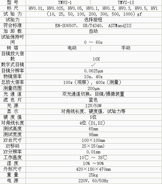 產(chǎn)品概述: • TMVS-1/TMVS-1S數(shù)顯自動(手動)磚塔顯微維氏硬度計在機械上采用精密的設(shè)計,,在電氣上由CPU控制試驗過程,,在光學(xué)上采用高清晰光學(xué)測量系統(tǒng)、光電傳感等新技術(shù) • 適用于測量微小、薄形試件、表面滲鍍處理后的零件和對瑪瑙、玻璃、陶瓷等脆性材料的顯微和努氏硬度的測定 以及涂層、表面覆層、層壓金屬、熱處理碳化層和淬火硬化層的深度與硬度梯度的測定。是科研機構(gòu)、工廠及質(zhì)檢部門進(jìn)行研究和檢測的理想的硬度測試儀器。 功能特點: • 操作由面板上的觸摸鍵輸入,能預(yù)置試驗力保持時間、選擇維氏或努氏試驗方法、調(diào)節(jié)測量光源的強弱等功能。 • 在LCD液屏上顯示測量壓痕長度、硬度值、試驗力保持時間,,測量次數(shù)等 • 硬度計可根據(jù)用戶特殊要求配置CCD圖像自動測量裝置、視頻裝置和攝像裝置。 技術(shù)參數(shù):