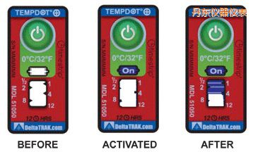 TempDot™Plus標(biāo)簽應(yīng)存儲(chǔ)在室溫下,并必須在反應(yīng)溫度閾值以上被激活。激活是通過(guò)用手指推壓。"On"字出現(xiàn)在第一個(gè)窗口中顯示激活。之后5分 鐘內(nèi),,在反應(yīng)溫度或低于反應(yīng)溫度的情況下將標(biāo)簽貼到產(chǎn)品上。藍(lán)色染料熔化并以控制的速率遷移,,經(jīng)過(guò)白色大窗口。這表示暴露在溫度閾值以上的累計(jì)時(shí)間。當(dāng)溫 度低于閾值時(shí),該染料固化并停止移動(dòng)。如果溫度超過(guò)閾值,TempDot®Plus標(biāo)簽提供即時(shí)的視覺(jué)跡象。