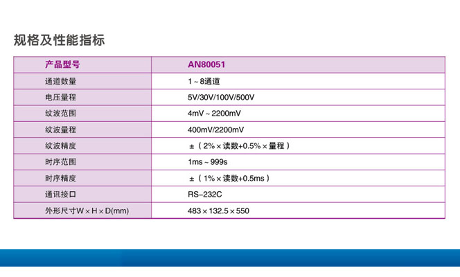 產(chǎn)品簡介 AN80051多通道時序紋波測量儀具有直流電壓紋波和時序測試功能,,主要應(yīng)用于各種家電電源、適配器和各種開關(guān)類電源的時序測試。