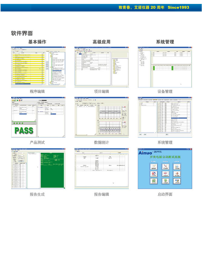 ATS系統(tǒng)軟件 AN8060自動(dòng)測試系統(tǒng)軟件包括功能強(qiáng)大的報(bào)表編輯能力、數(shù)據(jù)統(tǒng)計(jì)分析能力、多種多樣的文檔生成及系統(tǒng)用戶管理功能。軟件內(nèi)置報(bào)表模塊支持目前主流的文檔格式,,包括文本型、文檔型、報(bào)表型;同時(shí)允許用戶添加編輯多種類型的數(shù)據(jù),,如表格數(shù)據(jù)、波形數(shù)據(jù)、Microsoft Word對象等等。數(shù)據(jù)統(tǒng)計(jì)模塊提供專業(yè)的數(shù)據(jù)分析工具,,用戶編輯的測試程序中的所有測試條件、結(jié)果均可以在該模塊調(diào)用專業(yè)的函數(shù)分析處理,,處理結(jié)果可以保存為Microsoft Excel文件也可以打印。