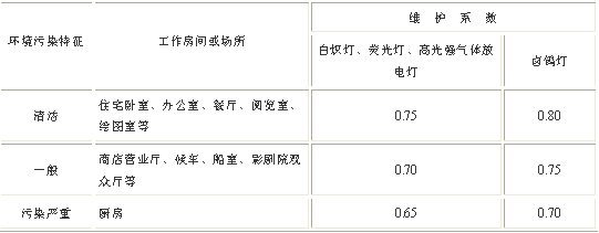 第2.1.4條 在照明設(shè)計時應(yīng)根據(jù)光源的光通衰減、燈具積塵和房間表面污染引起照度值降低的程度,除以表2.1.4中的維護系數(shù)。