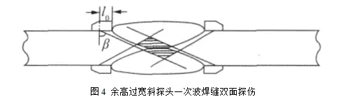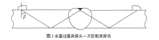 焊縫余高過寬時(shí)會(huì)出現(xiàn)焊縫中部盲區(qū)克服中部盲區(qū)的辦法是增大探頭角度和減小探頭前沿長度(圖4).