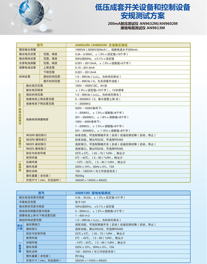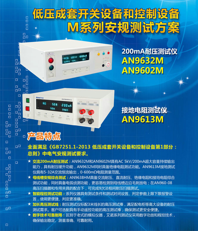 產(chǎn)品概述: 艾諾AN9602M耐壓測(cè)試儀具備交流耐壓輸出5000VAC/200mA(持續(xù)時(shí)間30分鐘),絕緣電阻測(cè)量范圍1~2000MΩ,并能快速準(zhǔn)確的完成上述性能指標(biāo)的測(cè)試,精密程控絕緣耐壓測(cè)試儀,能滿足各電器、元器件生產(chǎn)廠家和質(zhì)檢部門(mén)依照國(guó)際和國(guó)家安規(guī)標(biāo)準(zhǔn)進(jìn)行上述安全性能檢測(cè)的要求。 AN9632M絕緣耐壓測(cè)試儀具備交流耐壓輸出5000VAC/200mA(持續(xù)時(shí)間30分鐘),絕緣電阻測(cè)量范圍1~2000MΩ,臺(tái)灣絕緣耐壓測(cè)試儀,并能快速準(zhǔn)確的完成上述性能指標(biāo)的測(cè)試,能滿足各電器、元器件生產(chǎn)廠家和質(zhì)檢部門(mén)依照國(guó)際和國(guó)家安規(guī)標(biāo)準(zhǔn)進(jìn)行上述安全性能檢測(cè)的要求。